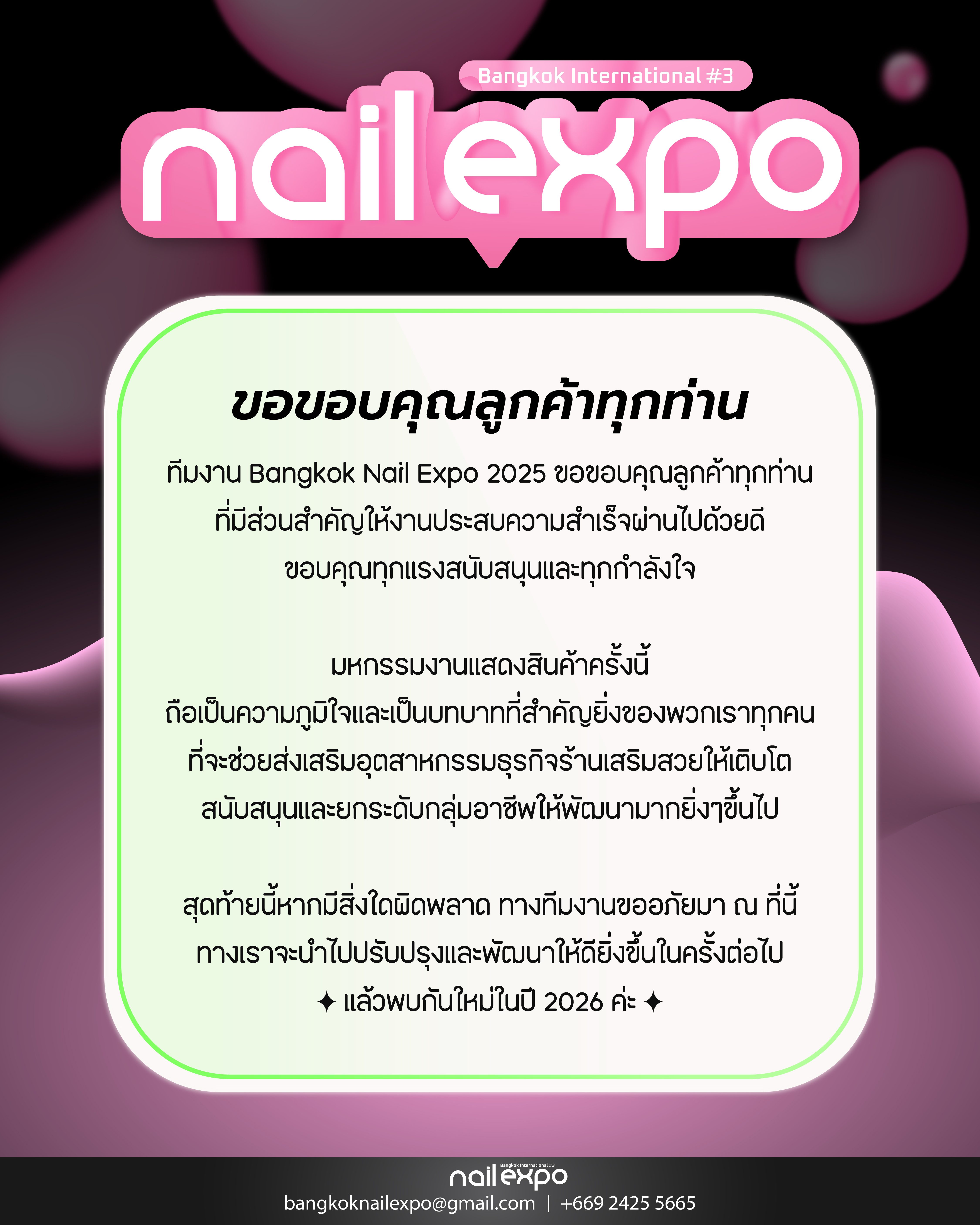 ทีมงาน Bangkok Nail Expo 2025 ขอขอบคุณลูกค้าทุกท่านที่ที่มีส่วนสำคัญให้งานประสบความสำเร็จผ่านไปด้วยดี ขอบคุณทุกแรงสนับสนุน และทุกกำลังใจ